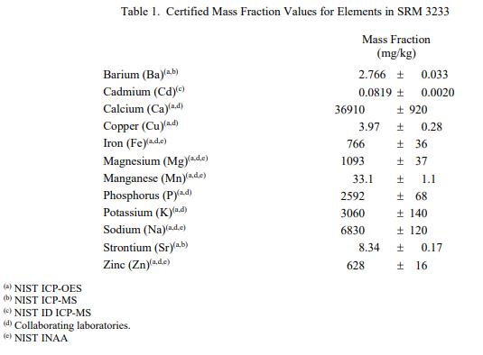 表 1 和表 2 提供了 SRM 3233 中元素和維生素的認(rèn)證質(zhì)量分?jǐn)?shù)值,以干質(zhì)量為基礎(chǔ)報(bào)告。NIST 認(rèn)證值是 NIST 對(duì)其準(zhǔn)確性有最高置信度的值因?yàn)樗幸阎蚩梢傻钠妬?lái)源都已被調(diào)查或考慮 [1]。價(jià)值分配分析由 NIST 和合作實(shí)驗(yàn)室進(jìn)行。認(rèn)證值計(jì)算為 NIST 方法的平均值、美國(guó)農(nóng)業(yè)部 (USDA) 方法的平均值以及合作實(shí)驗(yàn)室提供的平均結(jié)果的中位數(shù)(如果適用)。所有值在沒有加權(quán)的情況下合并。相關(guān)的不確定性以 95% 的置信水平表示 [2-4]。