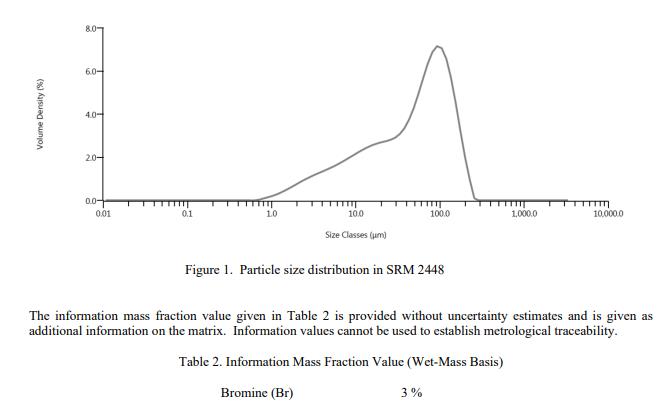 認證值在計量學上可追溯到 SI 質量單位,以濕質量為基礎的毫克/千克表示。信息值:溴的粒徑和質量分數的信息值分別在圖 1 和表 2 中提供。信息值被認為是 SRM 用戶感興趣的值,但沒有足夠的信息來評估與該值相關的不確定性,或者只有有限數量的進行了分析[3]。信息值不能用于建立計量溯源性。