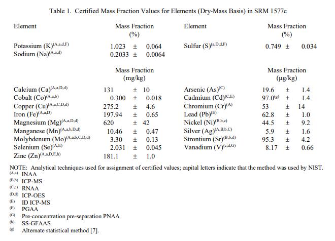 使用:在取出測試部分進(jìn)行分析之前,應(yīng)混合瓶子的內(nèi)容物。對于元素分析,推薦的最小樣品量為 100 mg;見下文“同質(zhì)性評(píng)估”。對于 25-羥基維生素.D3 的測定,推薦的最小樣品量為 2 g。 SRM 1577c 中元素的質(zhì)量分?jǐn)?shù)以干質(zhì)量為基礎(chǔ)報(bào)告。建議在元素分析之前用 CaSO4(例如 Drierite)干燥至穩(wěn)定質(zhì)量(約 10 天)。
