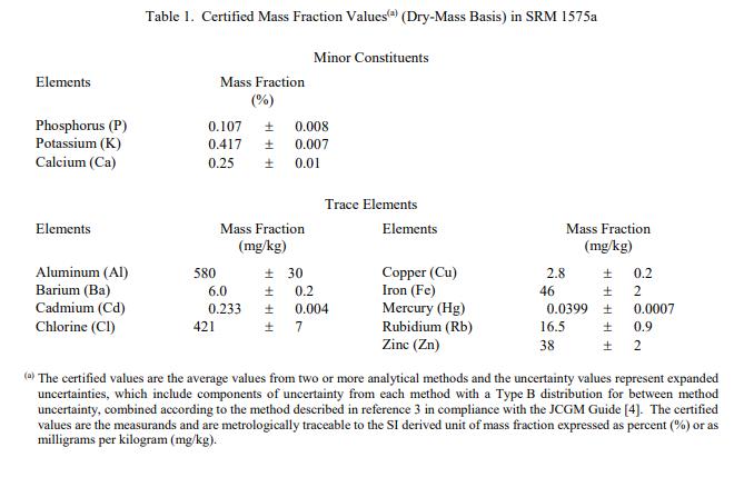 表 2 中提供了十一種成分的參考值,以基于干質(zhì)量的質(zhì)量分?jǐn)?shù)表示。參考值基于從單一 NIST 分析方法獲得的結(jié)果。參考值是未經(jīng)認(rèn)證的值,是對(duì)真實(shí)值的估計(jì)。但是,這些值不符合 NIST 認(rèn)證標(biāo)準(zhǔn),并且提供了相關(guān)的不確定性,可能不包括所有不確定性來(lái)源 [2]。信息值:表 3 中提供了兩個(gè)元素的信息值。信息值是一個(gè)值SRM 用戶可能感興趣,但沒(méi)有足夠的信息來(lái)評(píng)估與值相關(guān)的不確定性 [2]。信息值不能用于建立計(jì)量溯源性。